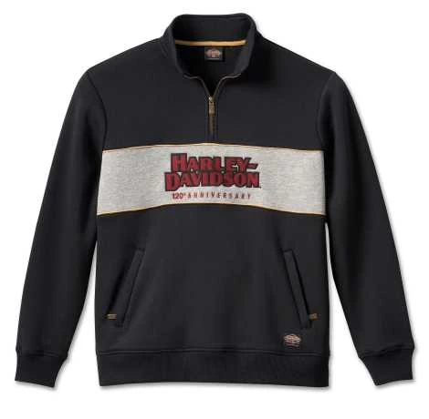 Original Harley-Davidson Herren Mockneck Sweatshirt aus der limitierten 120th Anniversary Kollektion. Es ist aus einer kuscheligen Fleece-Mischung aus Baumwolle und Polyester gefertigt und mit seinen Eingriffstaschen mit Reißverschluss das ideale Layer für kühlere Temperaturen. Der kontrastierende Brusteinsatz und das spezielle Jubiläums-Branding sorgen für einen Look, der unsere stolze Motorradtradition würdigt.