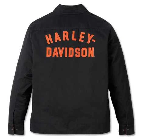 Kontrastreich, gesteppt, klassisch… so lässt sich der authentische Look unserer Harley-Arbeitsjacke zusammenfassen. Diese Jacke aus reißfestem Baumwolltwill mit kuscheligem Steppfutter ist eine moderne Variante des nostalgischen Mechanikerstils. Sie verfügt über einen robusten Reißverschluss vorne, verstellbare Ärmelbündchen mit Druckknopfverschluss, eine Innentasche für wichtige Dinge und einen versteckten Kragen mit Druckknopfverschluss, der beim Fahren nicht auffällt. Der Kontrast ist das wiederkehrende Thema, denn die Innenseite, die Taschen, der Kragen und der gestickte Schriftzug leuchten in unserem ikonischen Orange.
